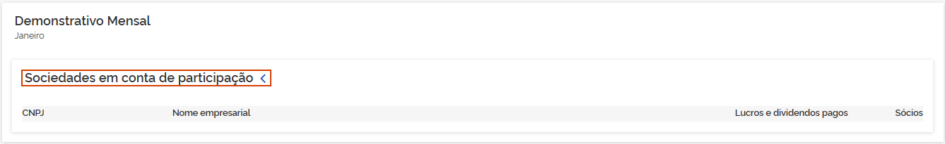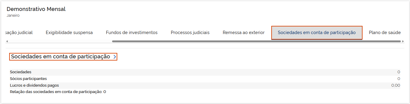 5.8 Sociedades em conta de participação: Os valores demonstrados são consolidados pelos informativos eSocial e EFD-Reinf. Em Sociedades em conta de participação, clique na seta >.