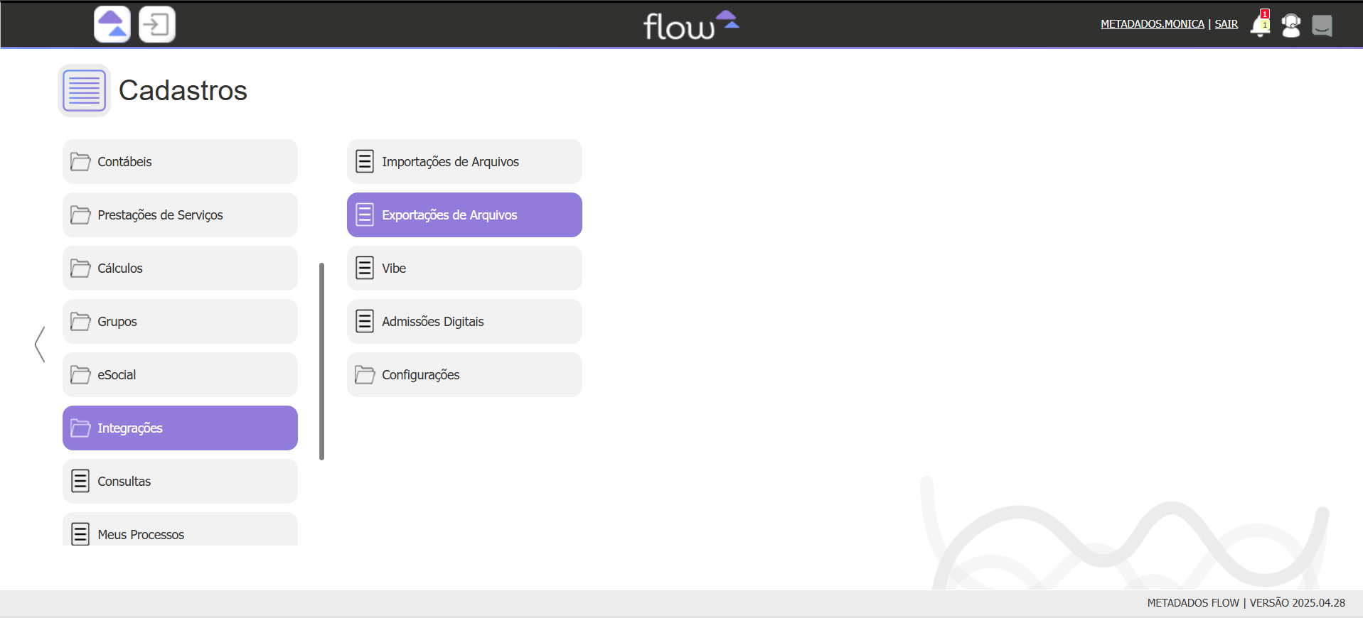 Acessar o módulo Cadastros, no menu Integrações > Exportações de Arquivos.