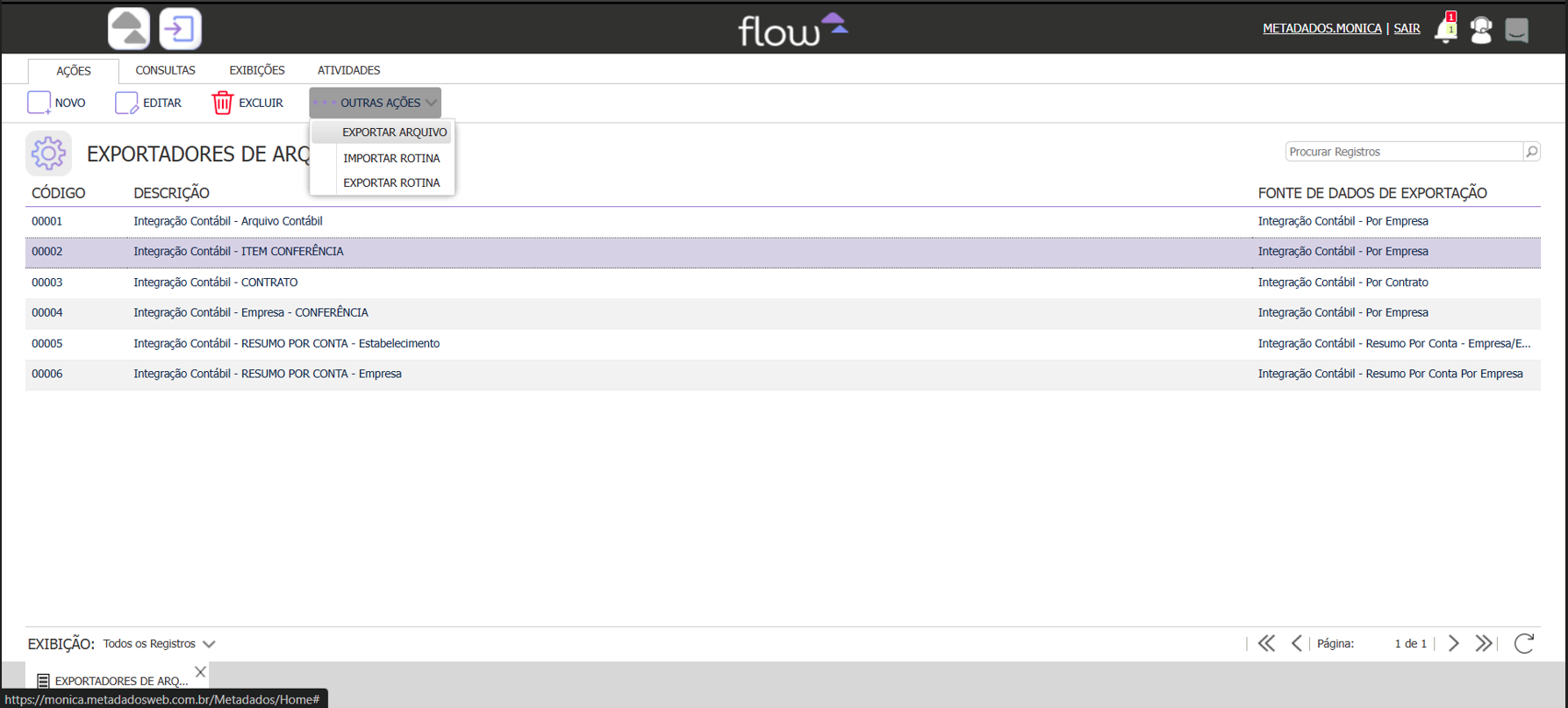 2. Selecione Integração Contábil – Item conferência > Outras Ações > Exportar Arquivo.