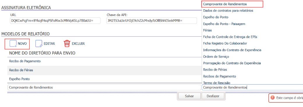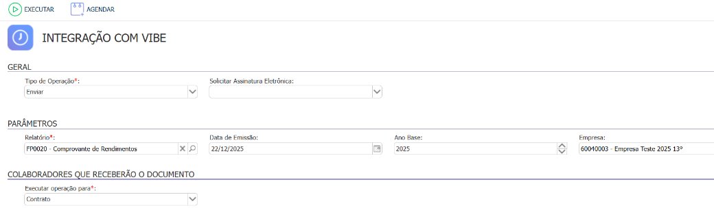 Configure o envio no Flow, em: Cadastros > Integrações > Configurações > Vibe, informando em Modelos de Relatórios, o modelo Comprovante de Rendimentos;
