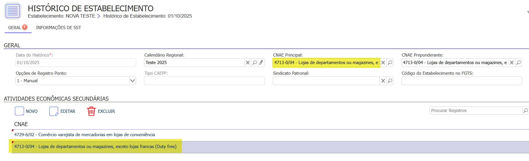 Situação: Ao salvar um histórico do estabelecimento, sistema apresenta a mensagem: Aviso: O CNAE das Atividades Econômicas Secundárias devem ser diferentes do CNAE Principal.