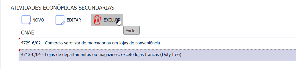 Selecione o CNAE no campo atividades econômicas secundárias e clique em excluir.
