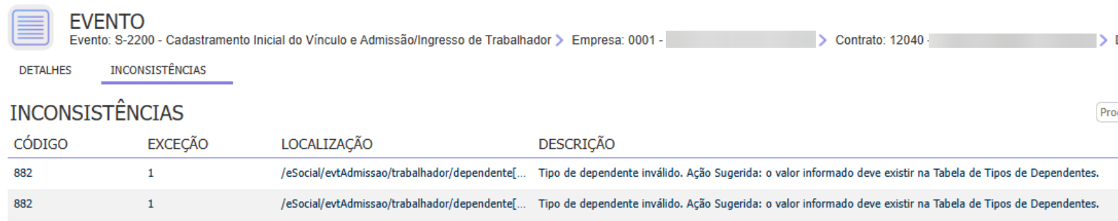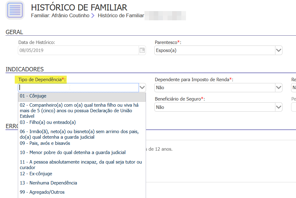 Causa: Este erro ocorre quando o empregado possuir Dependentes cadastrados com Tipo de Dependente incorreto.