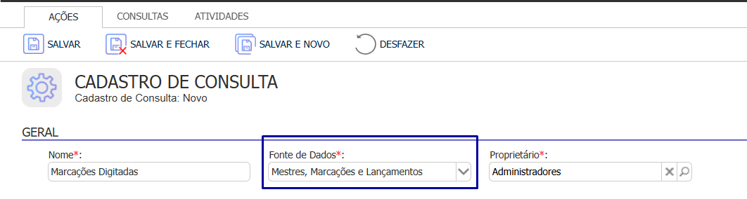 Fonte de Dados: selecione as opções Mestres, Marcações e Lançamentos.