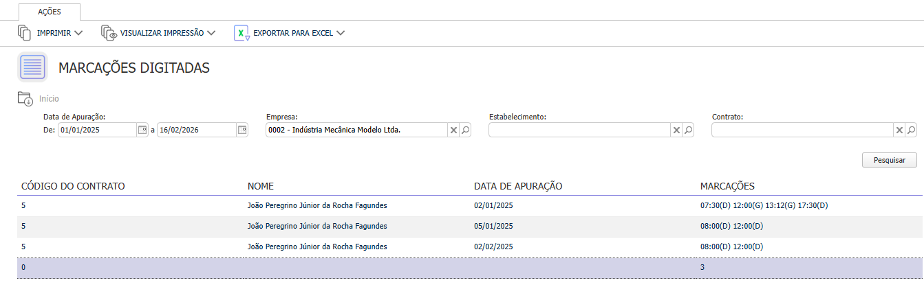 O relatório ficará disponível para consultas, será apresentado os dias que contém as marcações digitadas.