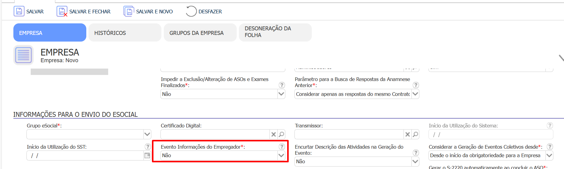 2º Se tratar de uma alteração, acesse o cadastro da empresa, exclua o histórico cadastrado. Em seguida inclua novamente, marcando o campo Evento Informações do Empregador como "Não".