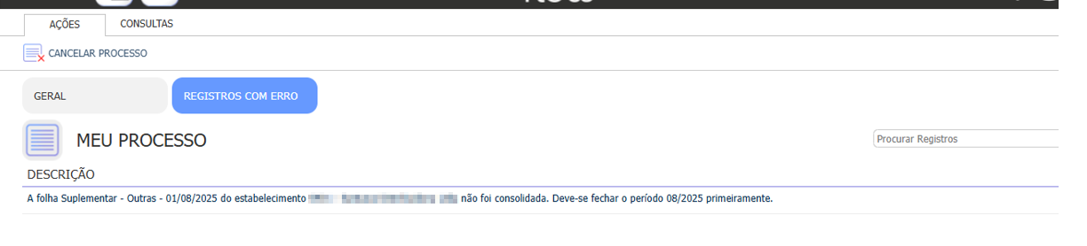Situação: Ao realizar a consolidação de folha está finalizando com o seguinte erro: A folha Suplementar - Outras do Estabelecimento X não foi consolidada. Deve-se fechar o período 08/2025 primeiramente.