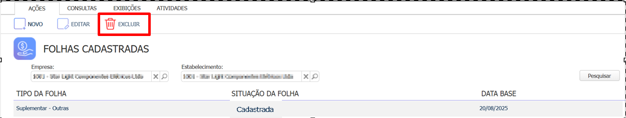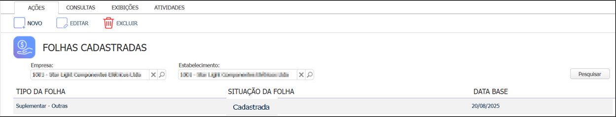 - Filtre pelo estabelecimento indicado na mensagem, e verifique se existe alguma folha com o status Cadastrada, na competência que está tentando consolidar.