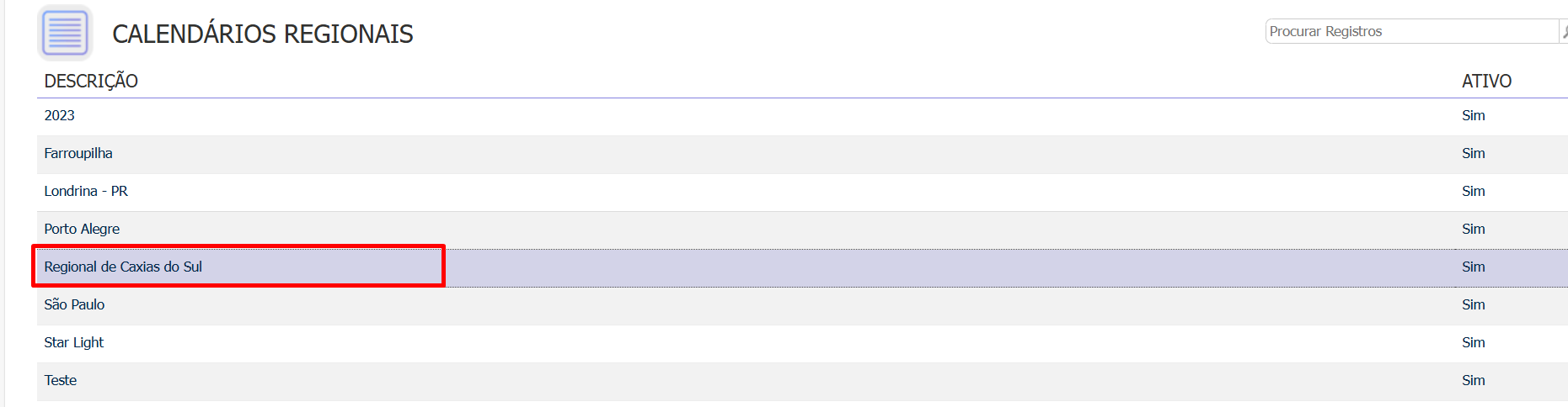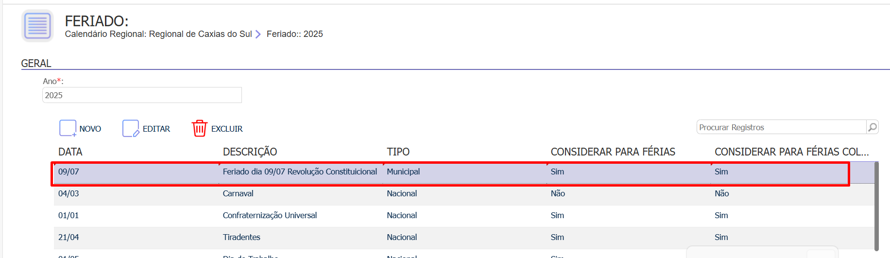 - No módulo de Cadastros, acesse o menu Empresariais > Tabelas Diversas > Calendários Regionais.