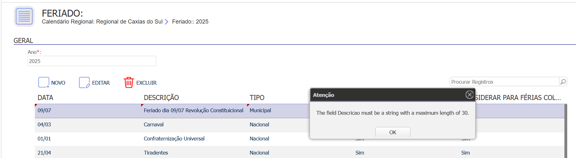 Causa: O motivo deste erro é a existência de um feriado cadastrado com mais de 30 caracteres.