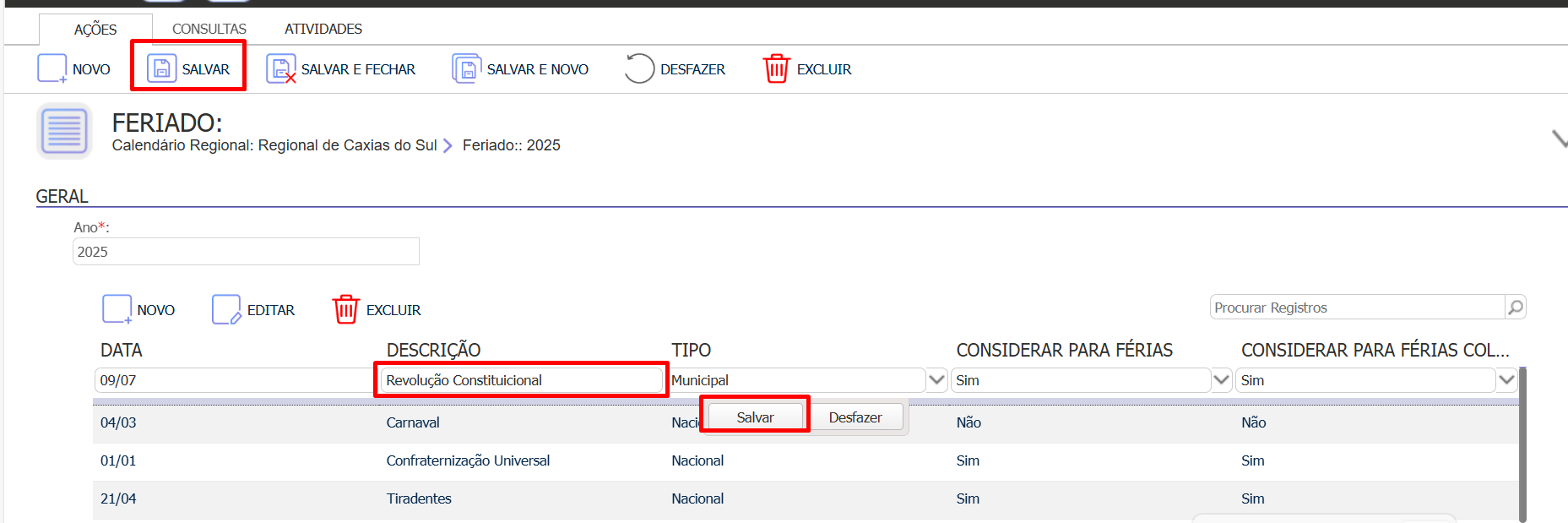 Ao realizar o cadastro do calendário regional, está finalizando com o seguinte erro: