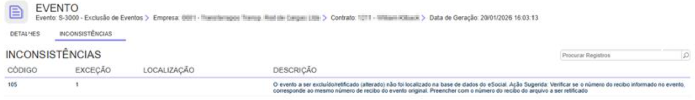 - O evento S-3000 será rejeitado no Gerenciador de Eventos pelo Motivo cód.105: O evento a ser excluído/ retificado (alterado) não foi localizado na base de dados do eSocial