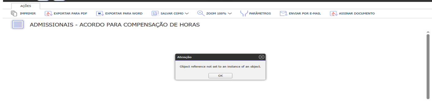 Ao tentar emitir o relatório de Acordo para compensação de horas, o sistema exibe a seguinte mensagem de erro: