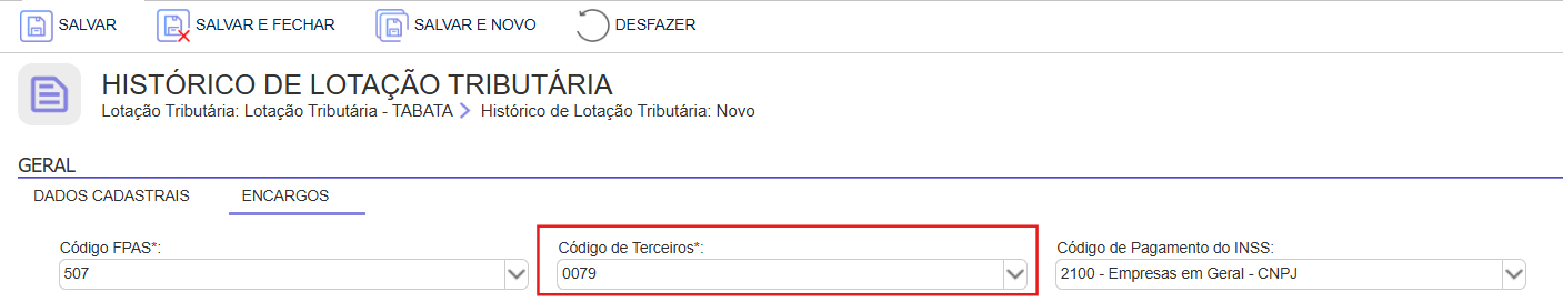 Insira a data da alteração e na guia Encargos altere o código de terceiros conforme a Tabela 04 - Códigos e Alíquotas de FPAS/Terceiros do layout do eSocial clique aqui.