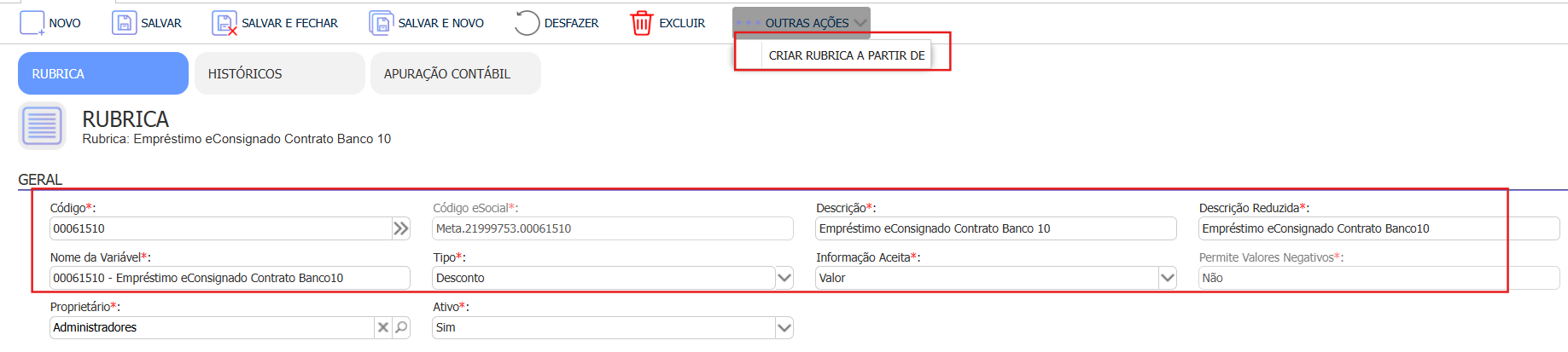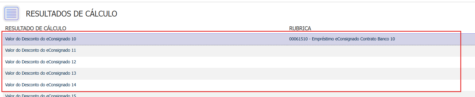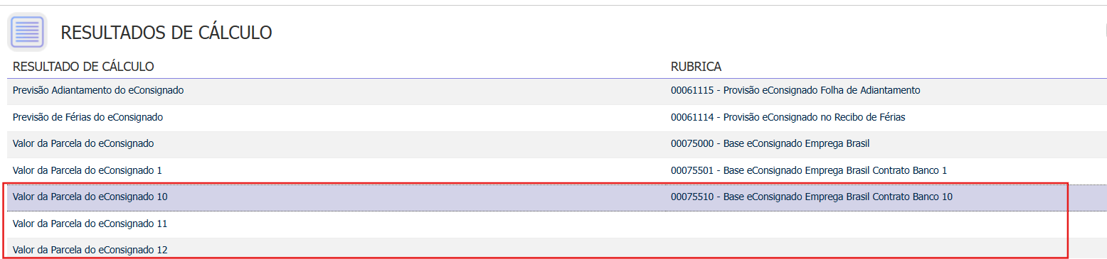 Nome da Variável: 00061510 - Empréstimo eConsignado Contrato Banco 10Vincular as rubricas de bases nos resultados de cálculo.