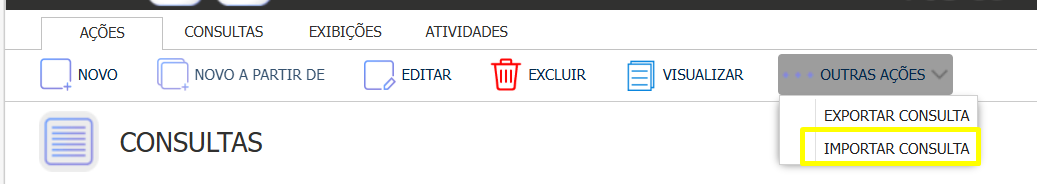 1. No Módulo Cadastros, acesse o Menu: Consultas - outras ações - Importar consulta.