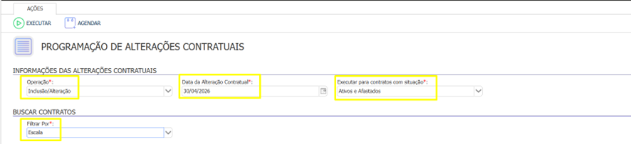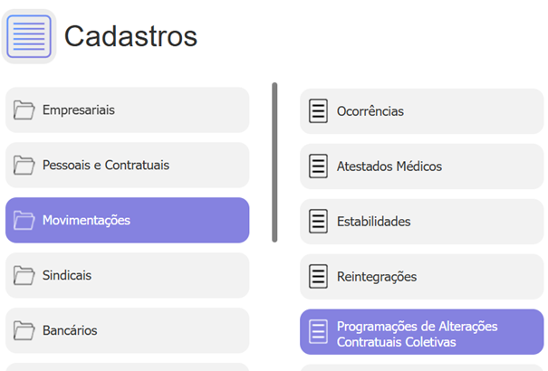 1. No Módulo Cadastros, acesse o Menu: Cadastros - Movimentações - Programações de alterações contratuais coletivas.