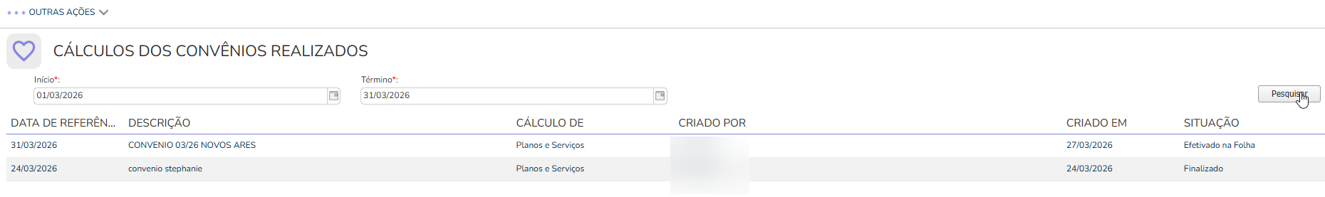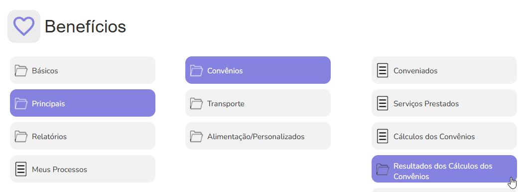 - Principais > Convêios > Cálculos Realizados;