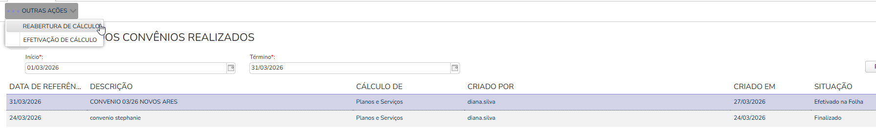 Para reabrir um cálculo de convênio já efetivado, acesse: